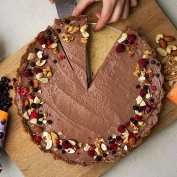 7. Tarte kurz vor dem Servieren mit gehackten Nüssen des Power-Nuss-Mixes und gefriergetrockneten Beeren toppen.